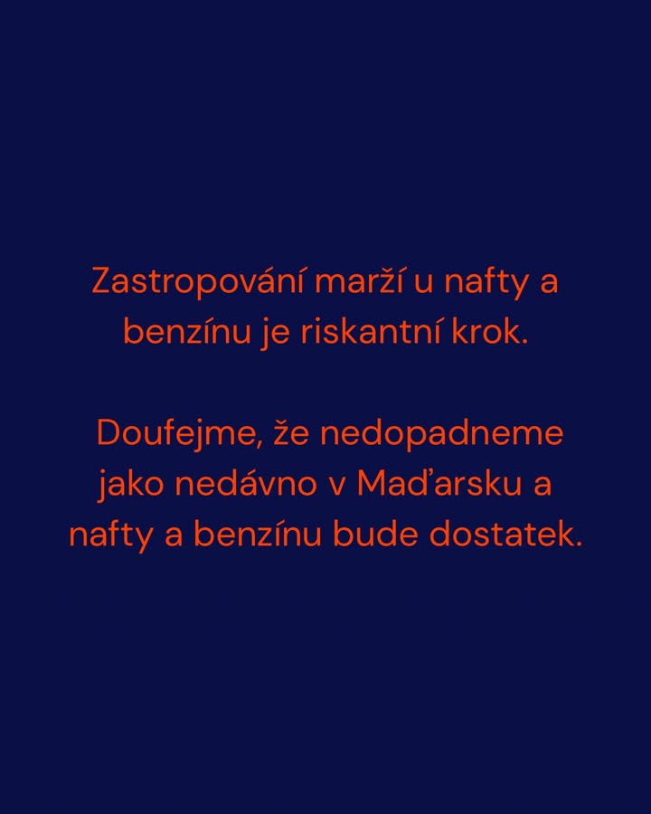 Zastropování marží u nafty a benzínu je riskantní krok. Doufejme, že nedopadneme jako nedávno v Maďarsku a nafty a benzínu bude dostatek. Především ale nechápu, proč vláda ještě nedávno vyprávěla, že nižší spotřební daň u paliv nepomůže, aby k tomu po několika týdnech od doby, kdy to ODS navrhovala, nakonec přistoupila. Je to jen další ukázka chaotického vládnutí, které poškozuje občany.